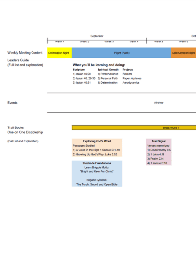 This document provides a visual overview of how a year of Stockade can be organized. It shows how the weekly Leaders Guides used for group meetings and the Trailbooks used for one-on-one mentoring can work together throughout the program year. By seeing how meetings, achievements, events, and discipleship fit together, leaders can better plan a balanced and meaningful year for their boys.